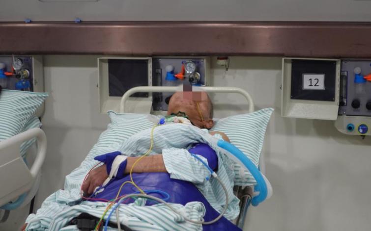 5月底,阿华转入我院时,呈睁眼昏迷状态,长期卧床、病情危重、反复出现肺部感染、重度衰弱、需呼吸机辅助呼吸,并插着深静脉导管、气管切开导管、鼻饲管、导尿管及胃管等多种导管,治疗配合度极低。重症康复团队立即开展救治、促醒及康复等处置,采用中西医互补、高压氧结合神经调控等综合促醒康复的方案治疗。